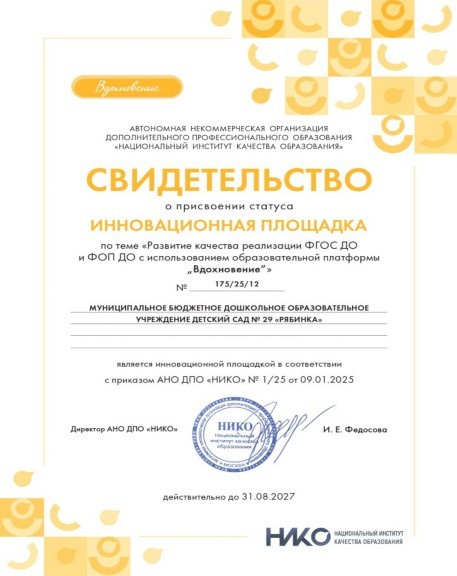 ПОЛОЖЕНИЕ о деятельности инновационных площадок АНО ДПО "Национальный институт качества образования (НИКО)" по теме "Развитие качества дошкольного образования с использованием инструментария МКДО на образовательной платформе "Вдохновение"